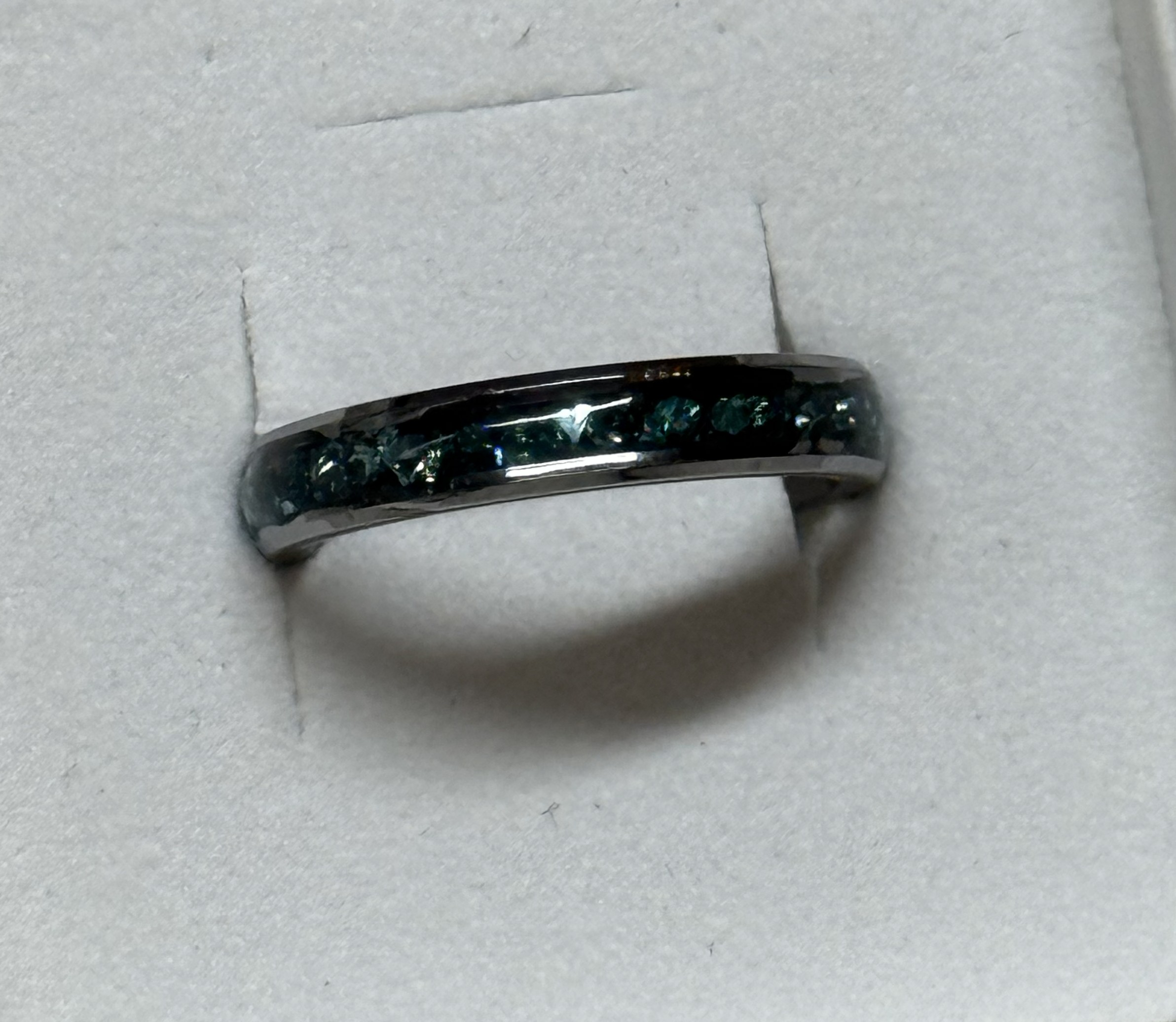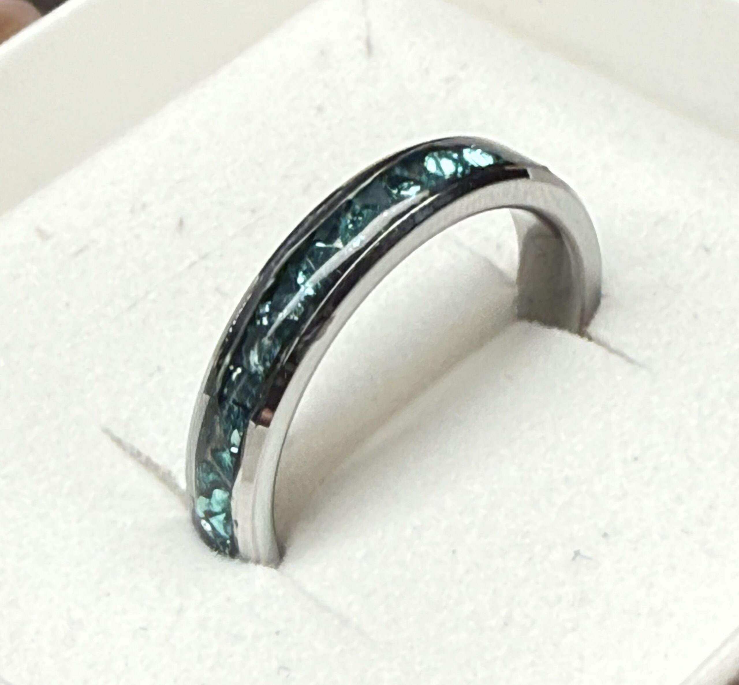The channel of the ring is carefully inlaid using cremation ashes, hair, or even breastmilk, preserved in resin and finished in your choice of colour. Each ring is individually handcrafted, ensuring no two pieces are ever the same — a truly personal memorial.
