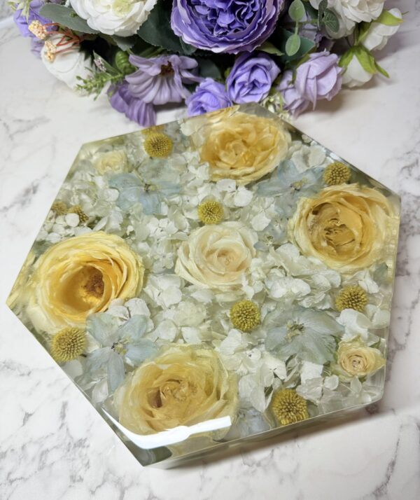 Create a bold, lasting tribute to your most cherished memories with our Large Hexagon Resin Keepsake. Measuring 20cm in diameter and 5cm deep, this statement piece is perfect for preserving medium to large flowers and a range of meaningful inclusions. Whether you’re commemorating a wedding, funeral, or other special occasion, this keepsake offers a stunning and spacious display that captures the beauty of the moment forever.